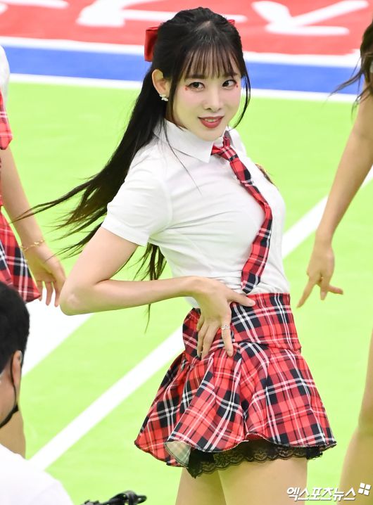 (엑스포츠뉴스 수원, 김한준 기자) 14일 오후 경기도 수원실내체육관에서 열린 ‘도드람 2023-2024 V-리그’ 한국전력과 OK금융그룹의 경기, 한국전력이 OK금융그룹에 세트스코어 3:0(25-23 25-22 25-21)으로 승리했다. 한국전력 치어리더 김한나가 열띤 응원을 선보이고 있다.김한준 기자 kowel@xportsnews.com