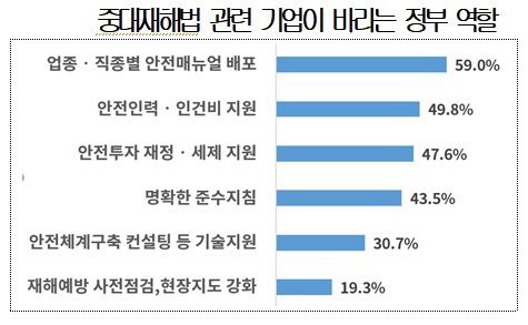 중대재해처벌법과 관련해 중소기업들이 정부에 바라는 역할에 대해 `업종별 안전매뉴얼 배포'(59%), `안전인력‧인건비 지원'(49.8%), `안전투자 재정‧세제 지원'(47.6%), `명확한 준수지침'(43.5%), `안전체계구축 컨설팅 등 기술지원'(30.7%) 등을 원했다.