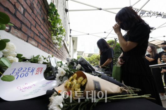 故 서이초 교사 49재 추모제가 열리는 9월 4일 서울 서초구 서이초등학교에 마련된 추모공간에서 추모객들이 추모를 하고 있다. 조현호 기자 hyunho@ |