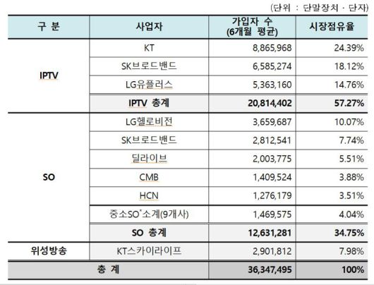 매체별로는 IPTV 3개사가 57.27%를, SO 14개사가 34.75%, 위성방송사 7.98%로 나타났다. IPTV 가입자는 0.53%포인트 증가했지만 SO와 위성방송 가입자는 0.36%포인트, 0.16%포인트 각각 감소했다. 2017년 IPTV 가입자 수가 SO 가입자 수를 처음으로 앞선 이후 IPTV 가입자 수는 증가하는 반면 SO는 감소하는 추세가 이어졌다.