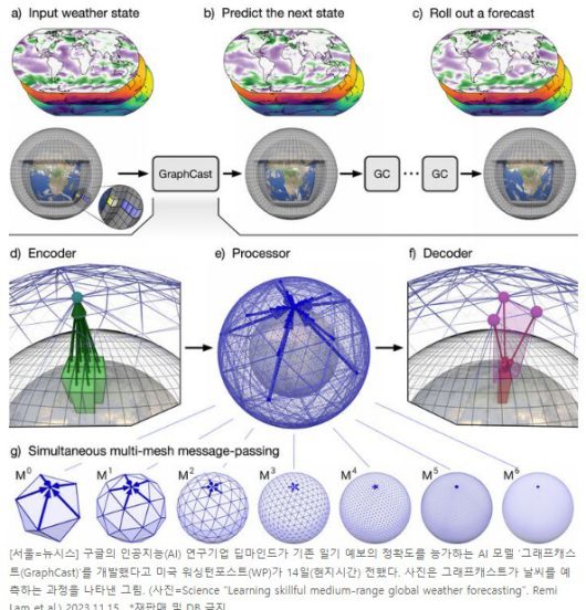 14일(현지시간) 미국 워싱턴포스트(WP)에 따르면 구글 딥마인드의 레미 람 연구팀은 과학 저널 '사이언스(Science)'에 날씨 예측 AI 모델 '그래프캐스트(GraphCast)'에 대한 논문을 게재했다. 그래프캐스트는 표준 기상 시뮬레이션 시스템인 유럽중기예보센터(ECMWF)의 고해상도 예보(HRES)보다 최대 10일간의 일기 예보를 더 정확하고 빠르게 분석한다.