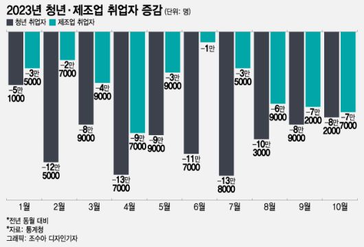 다만 고용 훈풍이 닿지 않는 곳이 있다. 청년과 제조업 부문이다. 만 15~29세 청년층 취업자 수는 지난해 11월부터 올해 10월까지 12개월 연속 감소(전년동월대비)했다. 전체 취업자 수가 2021년 3월 이후 32개월 연속 증가한 것과 대비된다.