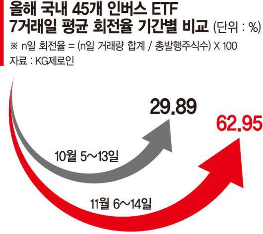 지난달 5~13일(7거래일) 간의 수치(29.89%)와 비교하면 약 2.1배 높다. 같은 기간 747개 정방향 ETF의 평균 회전율은 11.76%에 그쳤다.