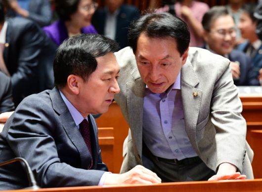 김기현 국민의힘 대표와 김석기 의원이 11일 국회에서 열린 의원총회에서 대화를 나누고 있다./이병화 기자 |