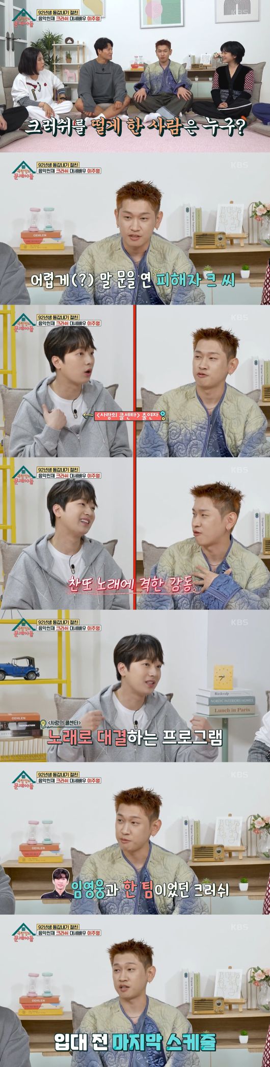 크러쉬는 "제가 예전에 '사랑의 콜센타'에 출연했다. 찬또 군의 노래를 듣고 너무 감동해서 무릎을 꿇어버렸다"라고 설명했다. 이찬원은 "'사랑의 콜센터'라는 프로그램이 노래와 노래가 맞대결하는 프로그램이었다. 크러쉬 씨가 임영웅 씨랑 같은 팀이었다. '남자라는 이유로'였나. 그 노래를 했다. 저는 정면을 보고 노래하니까 몰랐는데 모니터하니까 감동 받은 리액션을 해주셔서 감동을 받았다"라고 했다.