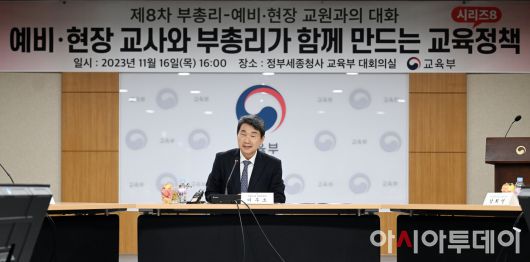 아시아투데이(세종) 박성일 기자 = 이주호 사회부총리 겸 교육부장관이 16일 오후 세종시 정부세종청사 대회의실에서 열린 현장교원 주례 소통 간담회에 참석해 모두발언을 하고 있다.
