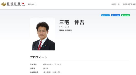 일본 총리관저 누리집에 게재된 미야케 싱고 외무대신정무관의 프로필 갈무리. 2023.11.16/ |