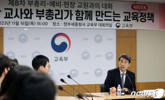 (세종=뉴스1) 김기남 기자 = 이주호 사회부총리 겸 교육부 장관이 16일 오후 세종시 정부세종청사에서 열린 현장교원 주례 소통 간담회 에 참석하여 예비교원 및 현장교원들과 이야기를 나누고 있다. 2023.11.16/뉴스1kinam@news1.krCopyright ⓒ 뉴스1. All rights reserved. 무단 전재 및 재배포, AI학습 이용 금지.