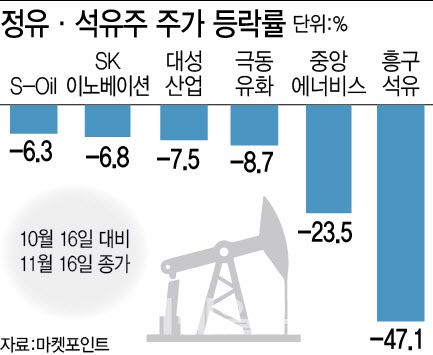 정유 사업을 전개하는 SK이노베이션(096770)도 이날 13만8800원으로 장을 마쳤으며, 한 달 전 14만9000원 대비 6.8% 떨어졌다.