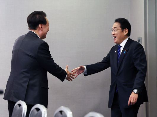 아시아태평양경제협력체(APEC) 정상회의 참석차 미국을 방문한 윤석열 대통령이 16일(현지시간) 샌프란시스코 한 호텔에서 열린 한일 정상회담에서 기시다 후미오 일본 총리와 반갑게 인사하고 있다./연합뉴스 |