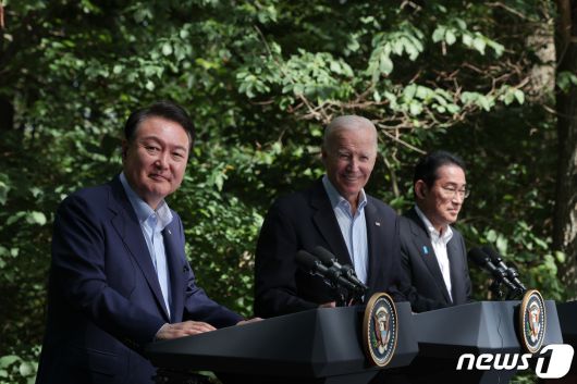 윤석열 대통령과 조 바이든 미국 대통령, 기시다 후미오 일본 총리가 18일(현지시간) 미국 워싱턴DC 인근 대통령 별장인 캠프 데이비드에서 한미일 정상 공동기자회견을 하고 있다. (대통령실 제공) 2023.8.18/뉴스1 ⓒ News1 안은나 기자 |
