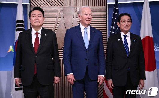 윤 대통령은 이날 오후 미국 샌프란시스코에서 바이든 대통령, 기시다 총리와 만났다. 한미일 정상은 사진 촬영을 위해 카메라 앞에 선 뒤 회담장으로 들어갔다.