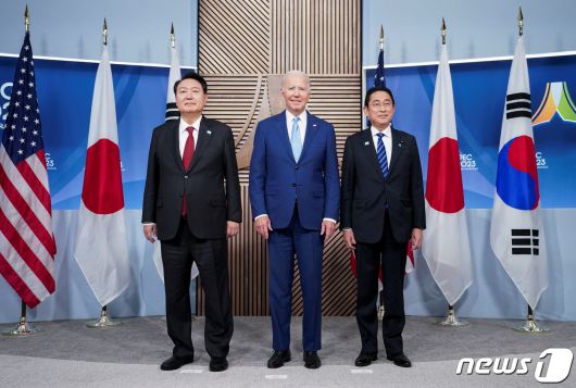 3국 정상은 앞서 지난 5월21일 주요 7개국(G7) 정상회의가 열린 일본 히로시마에서도 만나 야외 연단에서 기념 사진을 찍고 약 1분간 짧게 '스탠딩 회담'을 한 바 있다.