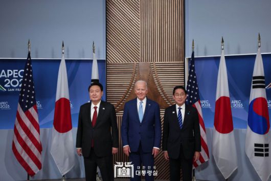 윤 대통령은 이날 오후 아시아태평양경제협력체(APEC) 정상회의가 열리고 있는 미국 샌프란시스코에서 바이든 대통령, 기시다 총리와 만났다. 세 정상이 별도로 만난 것은 지난 8월 18일 미국 캠프 데이비드에서 열린 한미일 정상회의 이후 3개월 만이다.