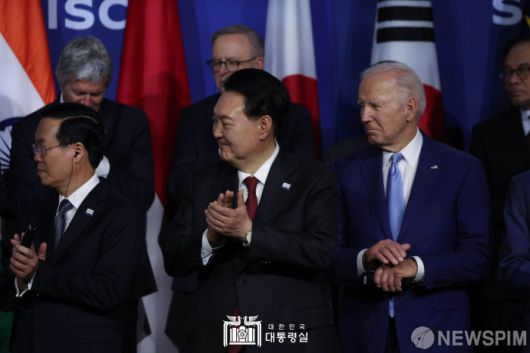 [서울=뉴스핌] 윤석열 대통령이 16일(현지시간) 미국 샌프란시스코 모스코니센터에서 열린 인도태평양경제프레임워크(IPEF) 정상회의에 참석, 조 바이든 미국 대통령과 함께 기시다 후미오 일본 총리의 발언을 듣고 박수치고 있다. [사진=대통령실] 2023.11.17 photo@newspim.com 저작권자(c) 글로벌리더의 지름길 종합뉴스통신사 뉴스핌(Newspim), 무단 전재-재배포 금지