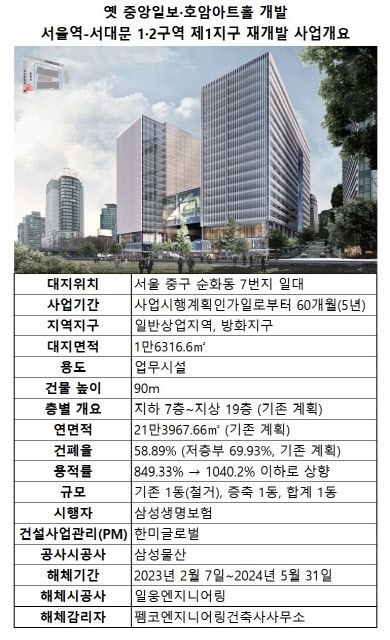 이 지역은 서울시 중구 순화동 7번지 일대로, 기존 건물은 호암아트홀이 있는 서소문빌딩(옛 중앙일보빌딩)이다. 기존 건물은 내년 5월 말 완전히 철거되며 삼성물산이 시공을 담당한다.