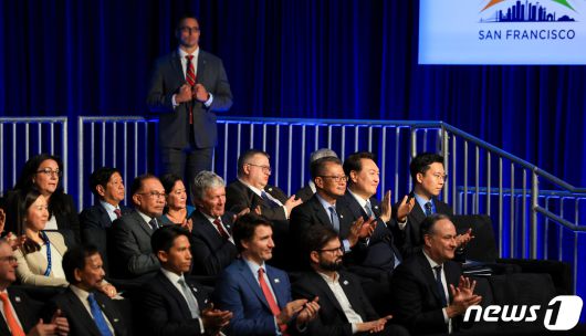 윤석열 대통령이 지난 15일(현지시간) 미국 샌프란시스코 과학관에서 열린 아시아태평양경제협력체(APEC) 정상회의 환영 리셉션에서 각국 정상들과 함께 손뼉치고 있다. (대통령실 제공) 2023.11.16/뉴스1 ⓒ News1 안은나 기자 |