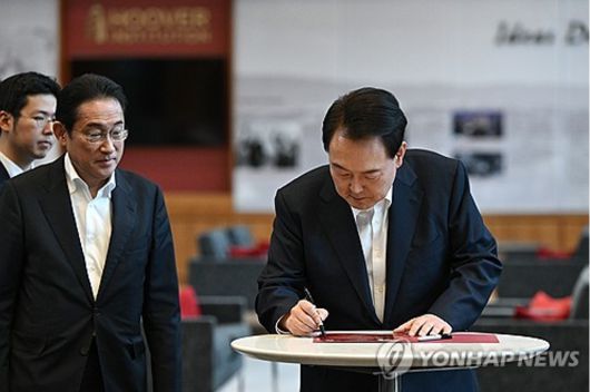 아시아태평양경제협력체(APEC) 정상회의 참석차 미국을 방문 중인 윤석열 대통령이 17일(현지시간) 미국 캘리포니아주 스탠퍼드대 후버연구소에서 열린 한일 정상 좌담회를 마친 뒤 좌담회 안내 인쇄물에 기념서명을 하고 있다. |