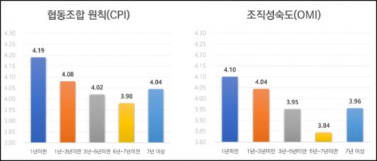그러나 10년이 지난 지금, 곳곳에서 협동조합 운영의 어려움을 토로하고 있다. 지난 글에서 들여다봤던 쿱인덱스가 이를 확인하는데 중요한 도구로 사용되기도 한다. 실제로 2022년 쿱인덱스 분석결과에 따르면 협동조합 원칙과 조직성숙도 연차별 결과에서 설립 6년차까지는 계속 점수가 떨어지다가 7년 이상부터 점수가 상향하는 추세를 보였다. 왜 이런 결과가 나오는 것일까?