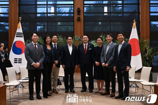 (서울=뉴스1) 오대일 기자 = 아시아태평양경제협력체(APEC) 정상회의 참석을 위해 미국을 방문 중인 윤석열 대통령과 기시다 후미오 일본 총리가 17일(현지시간) 미국 캘리포니아주 스탠퍼드대 후버연구소에서 열린 한일 스타트업 간담회에서 참석자들과 기념촬영을 하고 있다. (대통령실 홈페이지) 2023.11.18/뉴스1