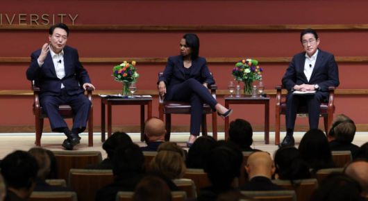 아시아태평양경제협력체(APEC) 정상회의를 계기로 미국을 방문한 윤석열 대통령이 기시다 후미오 일본 총리와 함께 스탠포드대 좌담회에 참석해 우정을 과시했다. 한일 정상이 제3국에서 나란히 행사에 참여한 것은 이번이 처음이다.