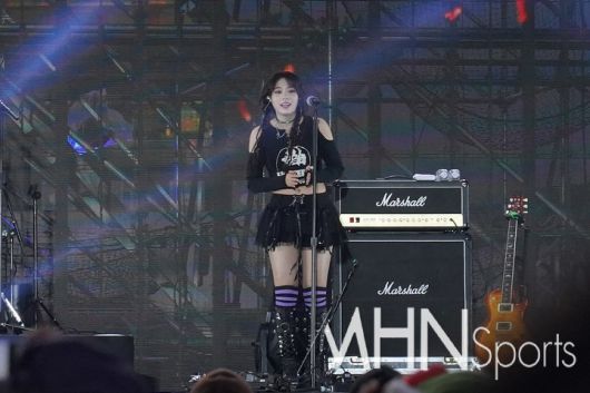 4인조 걸즈 밴드 QWER(마젠타/베이스-쵸단/드럼-시연/보컬-히나/기타)의 보컬, 시연이 관객들에게 인사를 준비하고 있다. 시연은 일본 걸그룹 NMN48에서 활동하다 지난 10월 밴드 QWER로 국내에서 공식 데뷔했다.