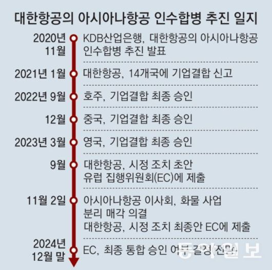 아시아나항공 이사회가 화물 사업 분리 매각 등의 내용이 담긴 최종 시정안(대한항공이 유럽 경쟁당국에 제출해야 했던)에 찬성하면서, 대한항공과 아시아나항공 통합은 계속 진행되게 됐습니다. 내년 1월쯤 유럽연합 집행위원회(EC)가 조건부 승인을 내주면, 내년 12월 20일쯤 최종 승인 여부가 판가름 날 전망입니다.