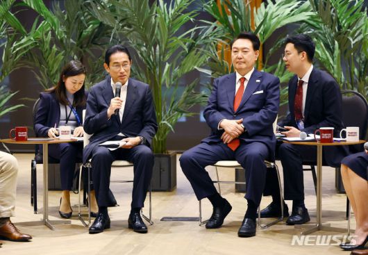 윤 대통령은 좌담회에서 “국제사회에서 저와 가장 가까운 기시다 총리님과 혁신의 산실인 스탠퍼드 교정을 함께 방문해 매우 기쁘다”며 “일본과 그동안 원만하지 않았던 관계를 다 청산했다”고 강조했다. 또 “한일 간 협력의 지평을 과학기술 분야로 확대해 나가기로 했다”면서 “한미일이 확고한 연대, 의지로 열어갈 새 시대에 여러분은 그 결실을 누리고 마음껏 도전하고 성장하길 바란다”고 했다.