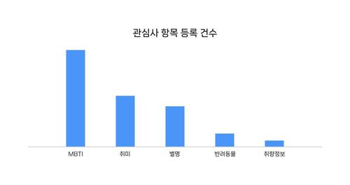 그 결과 관심사 등록 항목 가운데 가장 많이 등록된 정보는 MBTI였으며 취미, 별명, 반려동물, 취향 정보 등이 뒤를 이었다. MBTI의 경우 16개 유형 가운데 1000건 이상 등록된 1~3위는 모두 외향적 에너지와 상상력으로 사고하는 'EN'(1위 ENFJ·2위 ENFP·3위 ENTJ) 유형이 차지했다. 취미로는 독서, 여행, 골프 순으로 등록된 비중이 높았다.