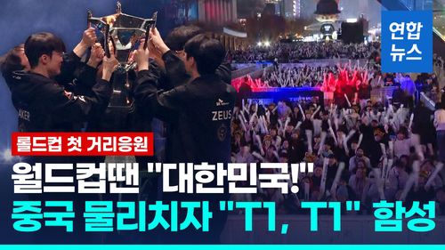 (서울=연합뉴스) 한국 팀 T1이 중국 팀 웨이보 게이밍을 꺾고 리그 오브 레전드(LoL·롤) 월드 챔피언십(롤드컵) 결승전에서 우승컵을 거머쥔 19일 저녁 서울 광화문 광장도 열광의 도가니로 변했습니다.