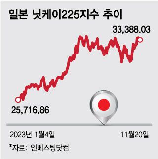 닛케이225지수는 이날 장중 거품경제 붕괴 이후 최고치인 3만3853까지 올랐다. 지난 17일 미국 뉴욕증시 상승 흐름이 아시아 시장으로 이어진 가운데 연준의 기준금리 인상 중단 기대와 미 장기금리 하락이 시장 참여자들의 투자심리를 자극했다. 앞서 글로벌 금융위기 직전인 2007년 이후 16년 만에 최고치에 달했던 미국 10년물 국채금리는 연준의 금리인상 행보가 중단됐다는 전망에 지난 17일 한 때 2개월 만의 최저치를 기록했다.