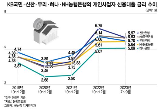 현재 금융권 개인사업자 대출 잔액은 약 700조원이며 대출자는 300만명에 달한다. 코로나 이전인 2019년 9월~12월 자영업자대출(신용대출 기준) 평균 금리는 연 3.87~4.74%였다가 올해 9월 기준 연 5.09~5.97%로 1%포인트 이상 올랐다.