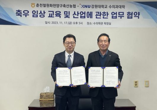 강원대학교(총장 김헌영) 수의과대학(학장 정배동)은 춘천철원화천양구축산농협(조합장 이중호)과 17일 춘천캠퍼스 수의학관 학장실에서 ‘축우 임상 교육 및 산업에 관한 업무’ 협약을 체결했다.