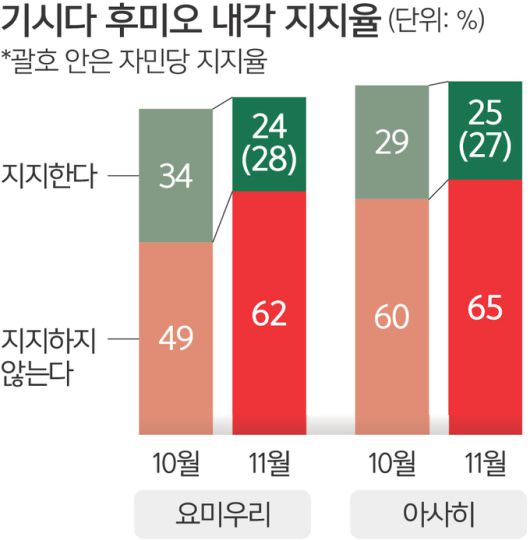 요미우리신문은 지난 17∼19일 실시한 여론조사에서 기시다 내각 지지율이 10월 조사 때보다 10%포인트나 떨어진 24%를 기록했다고 20일 보도했다. 지지하지 않는다는 대답은 13%포인트 상승한 62%였다. 아사히신문 조사(18∼19일 실시)에서는 지지한다 25%, 지지하지 않는다 65%였다. 두 조사 결과 모두 자민당이 민주당으로부터 정권을 되찾은 2012년 12월 이후 가장 낮은 수치다.