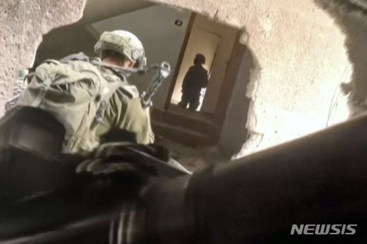 [가자지구=AP/뉴시스] ??이스라엘방위군(IDF)이 가자지구 이슬람사원(모스크) 안에 숨겨진 하마스의 무기 제조공장을 발견했다고 밝혔다. 사진은 지난 16일(현지시각) 이스라엘 군인들이 가자지구의 한 건물 내 통로를 따라 전진하는 모습. 2023.11.21