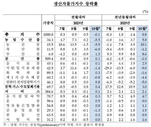 국내 출하에 수출품까지 더한 10월 총산출물가지수는 9월보다 0.2% 올랐다. 농림수산품은 5.4% 하락하고 공산품은 0.6% 상승했다.