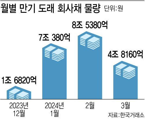 20일 한국거래소에 따르면 올해 만기가 돌아오는 회사채(일반사채 기준)는 △11월 3조2650억원 △12월 1조6820억원 등이다. 이후 내년 △1월 7조380억원 △2월 8조5380억원 △3월 4조8160억원 등으로 돌아오는 1~2월에만 15조원이 넘는 규모의 회사채 만기 도래 물량이 집중돼 있다.