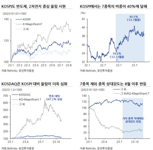 올해 주식시장에 대해서는 ‘쏠림과 테마’의 키워드로 요약해 평가했다. 강 연구원은 “미국에서는 ‘매그니피센트7’(빅테크7)을 중심으로, 국내에선 2차전지 밸류체인을 중심으로 쏠림이 나타나며 압도적 상승을 보였다”며 “쏠림이 완화되는 과정에서는 자금들이 고수익을 추구하며 초전도체주 등으로 흘러들어 테마주 장세가 나타나기도 했다”고 말했다.