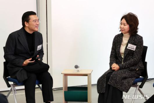 [서울=뉴시스] 박진희 기자 = 이옥경 서울옥션 부회장과 도현순 케이옥션 대표가 21일 서울 종로구 국립현대미술관 서울에서 열린 유인촌 장관의 '미술계 현장간담회'에 참석하여 인사를 나누고 있다. 2023.11.21. pak7130@newsis.com