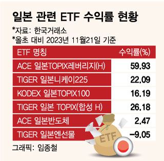 일본 증시 상승에 베팅해 ETF(상장지수펀드)를 사들인 일학개미들도 웃음짓는다. 도쿄증시 1부 종목을 모두 반영한 토픽스(TOPIX) 지수를 2배 추종하는 ACE 일본TOPIX레버리지(H) ETF는 올초부터 이날까지 59.93% 상승했다. 닛케이225지수를 추종하는 TIGER 일본니케이225 ETF도 같은 기간 22.09% 상승했다.