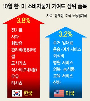 10월 소비자물가 한국 3.8% - 미국 3.2%