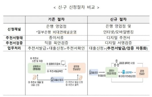 하지만 앞으로 추천서 제출없이 은행 영업점 또는 모바일뱅킹을 통해 대출을 신청하면 디지털 추천서가 실시간으로 발급되어 대출을 접수할 수 있다. 다만 은행별 서비스 제공 채널(영업점 및 인터넷·모바일뱅킹) 및 서비스 제공시간은 상이할 수 있다는 설명이다.