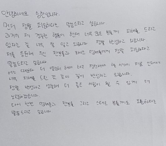 [OSEN=유수연 기자] 사생활 논란으로 활동을 중단한 그룹 라이즈 승한이 자필로 사과를 전했다.