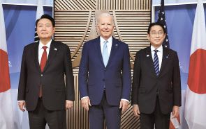 아시아태평양경제협력체(APEC) 정상회의 참석차 미국을 방문 중인 윤석열 대통령이 16일(현지시간) 미국 샌프란시스코 모스코니센터에서 열린 한미일 정상 회동에서 조 바이든 미국 대통령, 기시다 후미오 일본 총리와 기념촬영을 하고 있다. [연합] |