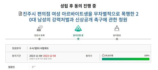 22일 국회 국민동의청원 사이트에 따르면 지난 8일부터 동의를 받기 시작한 ‘진주시 편의점 여성 아르바이트생을 무차별적으로 폭행한 20대 남성의 강력 처벌과 신상 공개 촉구에 관한 청원’이 5만명 이상의 동의를 받았다. 이날 오후 1시 30분 기준 5만815명이 동의했다.