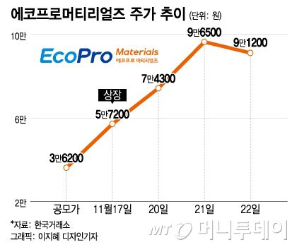 에코프로머티리얼즈는 지난 17일 코스피 시장에 상장한 이후 줄곧 급등세를 이어왔다. 상장 당일 공모가(3만6200원) 대비 58% 상승 마감한데 이어 20일과 21일에는 2거래일 연속 상한가를 기록했다. 시가총액은 공모가 기준 2조5700억원에서 현재 6조2800억원으로 단숨에 2배 이상 뛰었다.