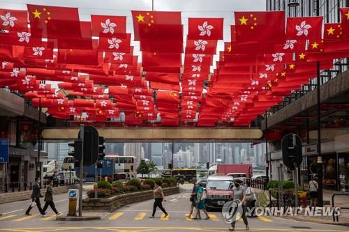 홍콩 거리에 내걸린 홍콩 깃발과 중국 국기 |