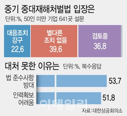 실제 대한상공회의소가 50인 미만 회원사 641곳을 대상으로 조사한 결과, 응답기업 중 22.6%만이 중처법 대응 조치를 했다고 답했다. 나머지는 ‘별다른 조치 없이 종전 상태를 유지’(39.6%)하거나 ‘조치사항 검토 중’(36.8%)이다. 중처법 대처가 어려운 이유로는 △안전관련 법 준수사항 방대(53.7%) △안전관리 인력 확보(51.8%) 등을 꼽았다.