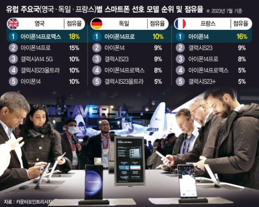 올해 7월 기준 독일, 영국, 프랑스 등 국가에서는 갤럭시S23·23+를 비롯해 갤럭시S23울트라가 상위 5위권 안에 드는 모습도 보였다.