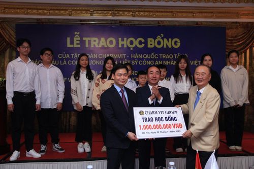 (하노이=연합뉴스) 김범수 특파원 = 이대봉 참빛그룹 회장이 22일(현지시간) 베트남 공안부에 전쟁 유가족 자녀를 위한 장학금 10억동(약 5천400만원)을 기부했다.